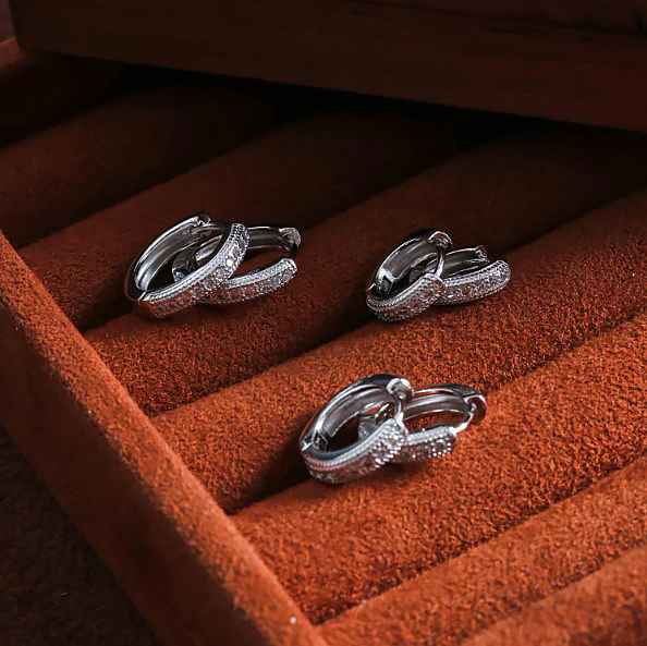 Brinco em formato de argolinha cravejada com microzircônias. Disponíveis nos tamanhos P, M e G. Produto hipoalergênico. Banhado a Ouro Branco.