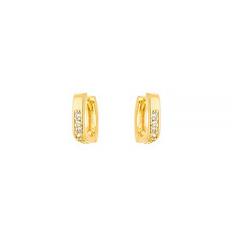 Brinco em formato de argola quadrada com pontas arredondadas, cravejadas com microzircônias incolores. Produto hipoalergênico. Banhado a Ouro 18K.