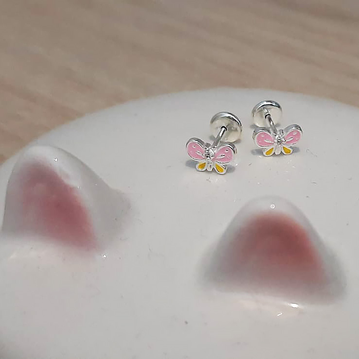 Descrição: Brinco infantil em formato de borboleta resinados. Produto hipoalergênico. Em Prata 925.