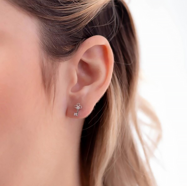Descrição: Brinco em formato de mini chave, cravejado com microzircônias. Produto hipoalergênico. Banhado a Ouro Branco