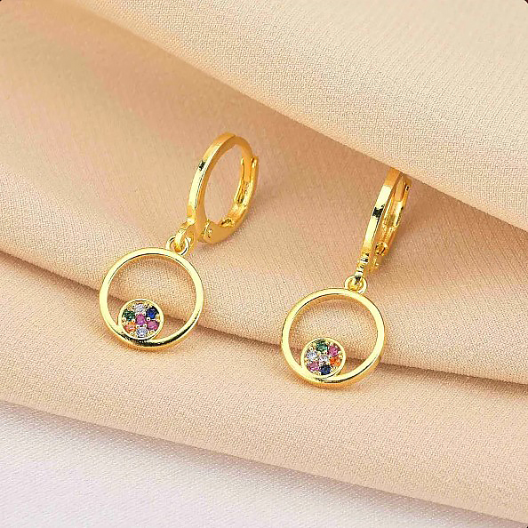 Descrição: Brinco articulado com pingente circular cravejado com microzircônias. Produto hipoalergênico