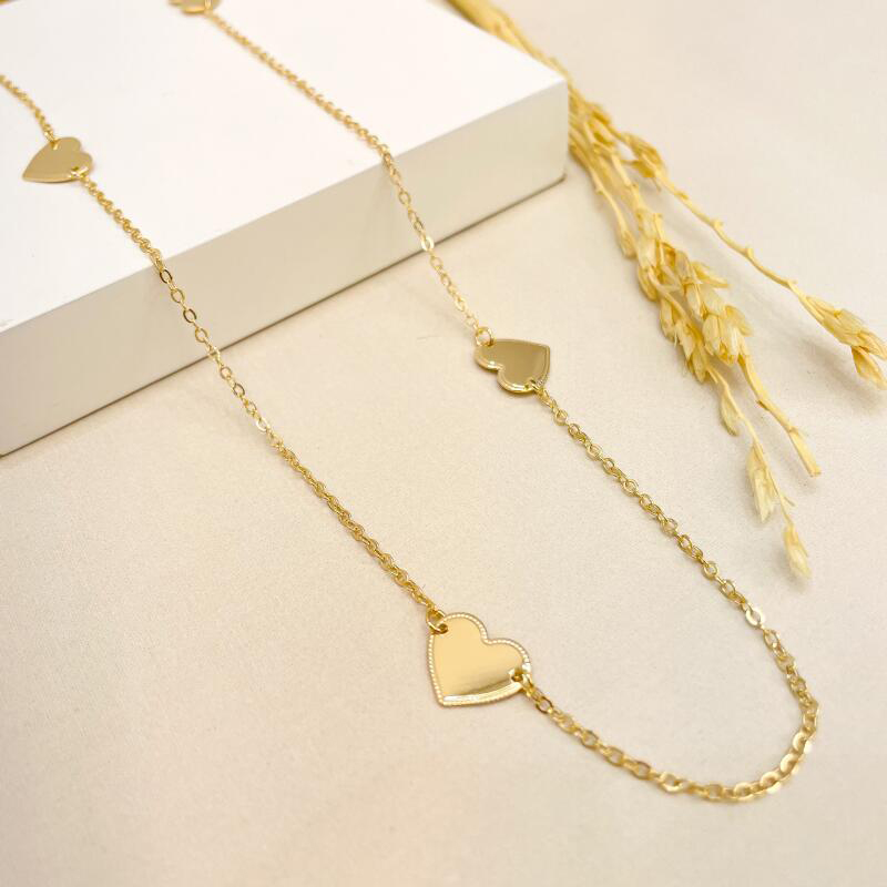 Descrição: Colar com corrente goumet, pingentes fixos em formato de coração. Produto hipoalergênico. Banhado a Ouro 18K.
