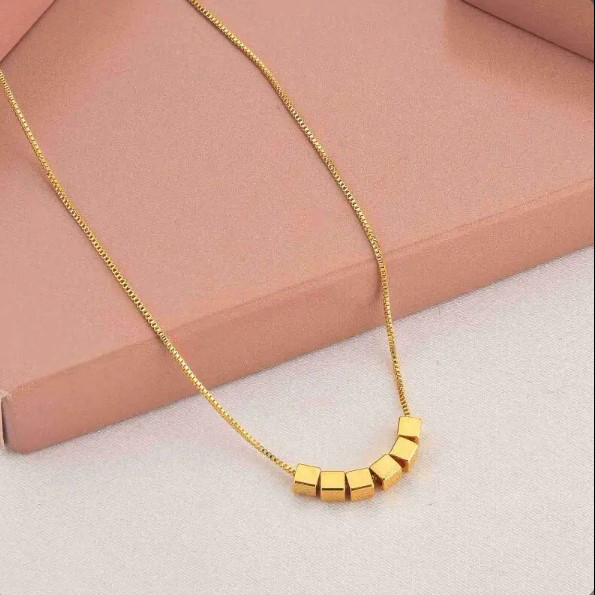 Descrição: Colar com corrente veneziana e seis pingentes em formato de cubos lisos. Banhado a Ouro 18K. Produto hipoalergênico.