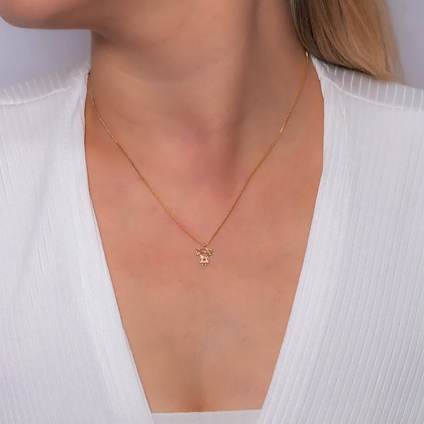 Colar com corrente veneziana e pingente em formato de menina com microzircônia pink.