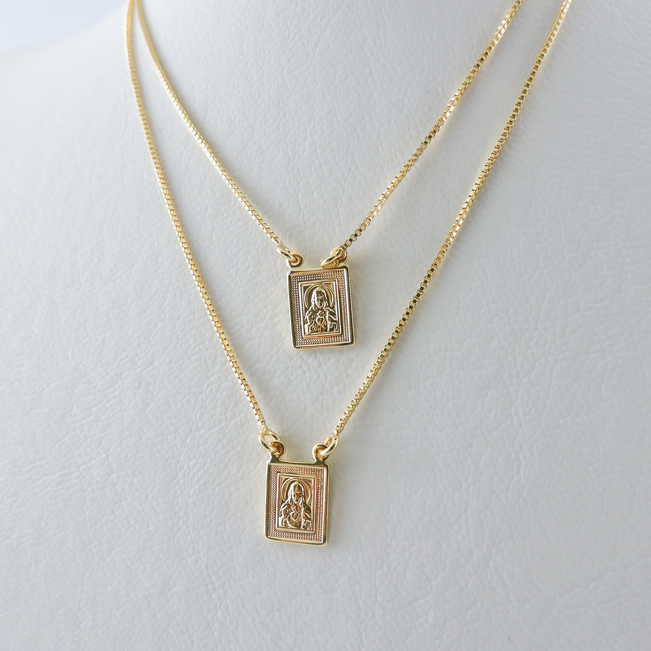 Descrição: Escapulário com corrente veneziana com 2 pingentes Sagrado Coração de Jesus. Produto hipoalergênico. Banhado a Ouro 18K.